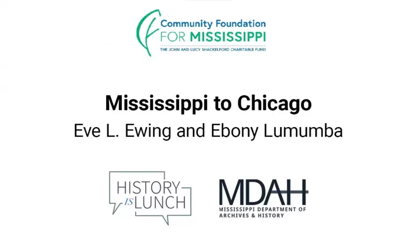 On July 20, 2022, author and sociologist Eve L. Ewing and Ebony Lumumba presented “Mississippi to Chicago” as part of the History Is Lunch series. The program was part of a joint 2022 initiative by MDAH and the Mississippi Museum of Art focusing on the Great Migration.