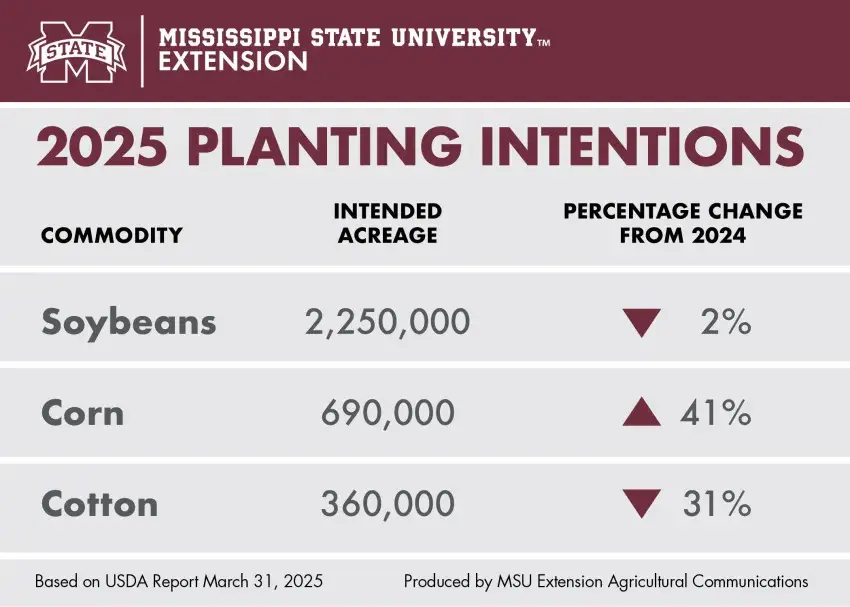 Surveys are conducted with farm operators nationwide during the first two weeks of March to collect data on which row crops they plan to plant and how many acres. In Mississippi, growers intend to plant 41% more corn in 2025 than the previous year, but 31% less cotton. (Illustration by MSU Extension Service)
