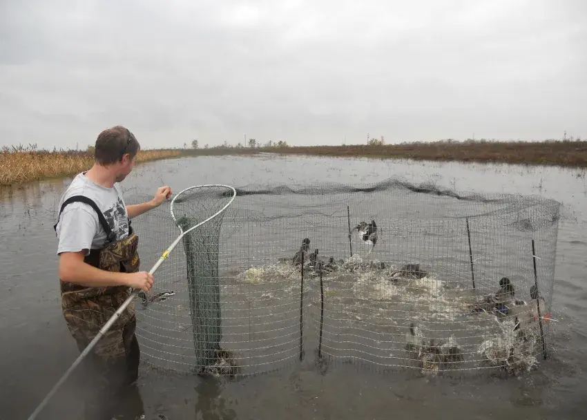 A researcher carefully removes mallards from a baited swim-in trap. Constructed with a wire frame and covered with bird-safe netting, the trap allows ducks to enter through a small opening while foraging on bait but prevents their escape. Using a dip net, the researcher gently retrieves the ducks to band them, attach transmitters and release them for tracking. (Courtesy photo/Joe Lancaster)