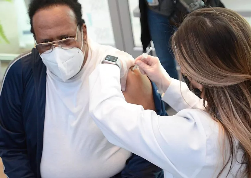 W. L. Hightower, pastor of New Zion Baptish Church in Louisville, receives the Moderna vaccine, administered by Mississippi State Department of Health Phamacist Kathryn Ward at New Hope Baptist Church in Jackson. Hightower was among a number of African American faith leaders from across the state to receive the COVID-19 vaccination Monday at New Hope Baptist Church in Jackson. Credit: Vickie D. King/Mississippi Tower