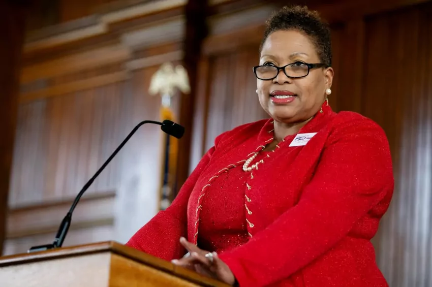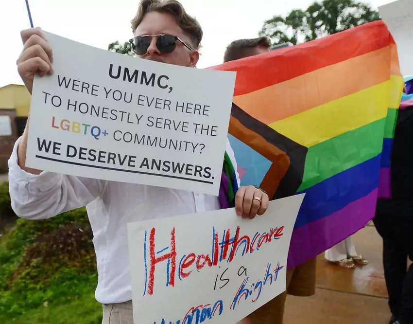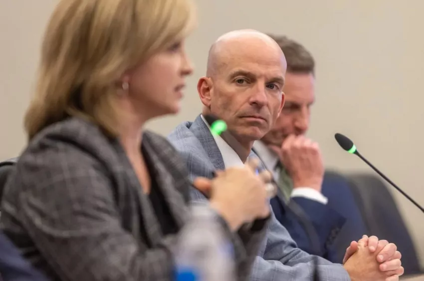 Dr. Alan Jones, associate vice chancellor for clinical affairs at UMMC, center, listens as Dr. LouAnn Woodward, vice chancellor for health affairs and dean of the School of Medicine, answers questions during a Health Affairs Committee meeting at the Universities Center in Ridgeland, Miss., Wednesday, January 18, 2023. Credit: Eric Shelton/Mississippi Today