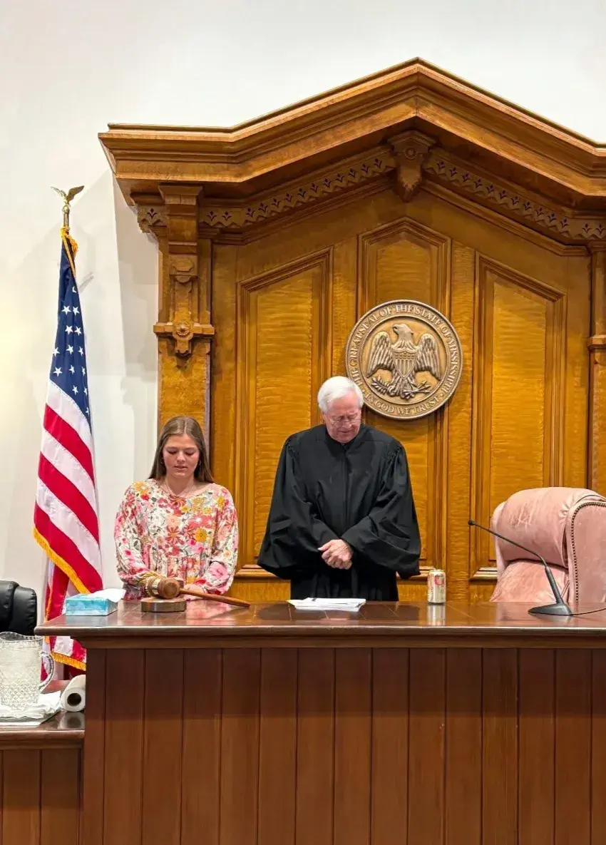 Strayhorn High School senior Sara Kate Blaine, left, provides the opening prayer Wednesday, April 9, before a session of Tate County Chancery Court led by Chancellor Percy Lynchard. Blaine is the daughter of Shawnda and Richard Blaine.
