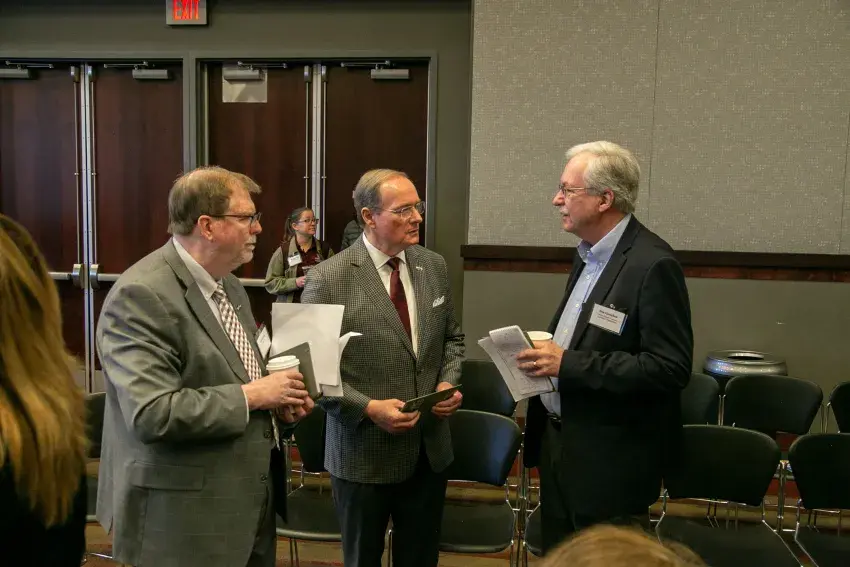 Mississippi State University Vice President for the Division of Agriculture, Forestry, and Veterinary Medicine Keith Coble, left, and MSU President Mark E. Keenum, center, talk with Special Representative of the U.N. Food and Agriculture Organization Director-General Dan Gustafson during MSU’s first Food and Agriculture as National Security Conference March 21. More than 250 experts from the military, agriculture and global food sectors participated, examining their interconnectivity in promoting stability and resilience in the U.S. and globally. (Photo by Michaela Parker)