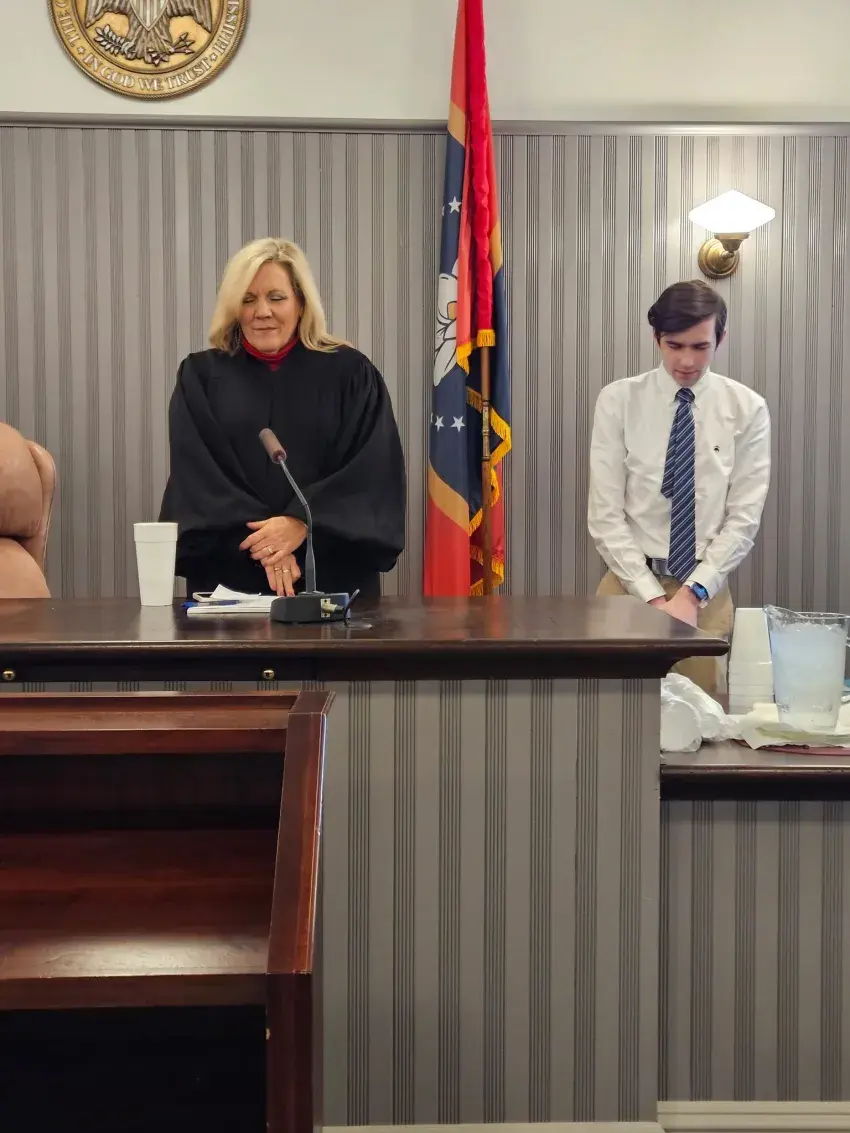 Noah Powell, right, provided the opening prayer Monday, Feb. 3, before a session of Tate County Chancery Court led by Chancellor Vicki B. Daniels. Powell, a senior at Magnolia Heights School, is the son of John and Jennifer Powell.