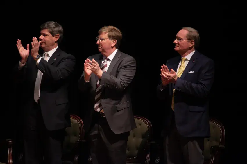 Mississippi State University President Mark E. Keenum, left, and East Mississippi Community College President Scott Alsobrooks cut the ribbon Wednesday [Jan. 29] for the MSU at the Communiversity partnership through the Advancements in Manufacturing Upskilling Program, better known as AiM UP. This partnership will provide workforce training for industry both inside the Golden Triangle and across the state. (Photo by Grace Cockrell)