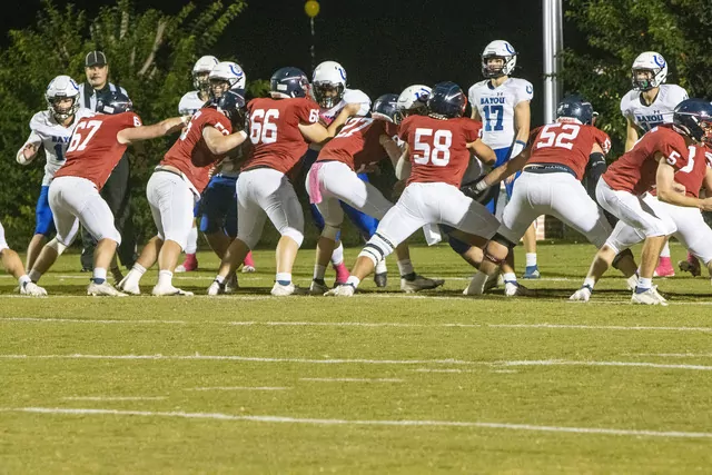 All year long the guys up front work hard to make things happen. Here Dylan Birkhead #67, John Ellis Price #56, Baylor Sowell #66, Brendan Clayton #27, Chase Jennings #58, Dylan Cain #52, and Brantley Mobley #5, protect the backfield and help get yardage in the last game of the season for the Magnolia Heights Chiefs. The Chiefs were defeated by Bayou Academy in the season ending battle by a score of 45 to 27. (Photos by Rickey Haynes)