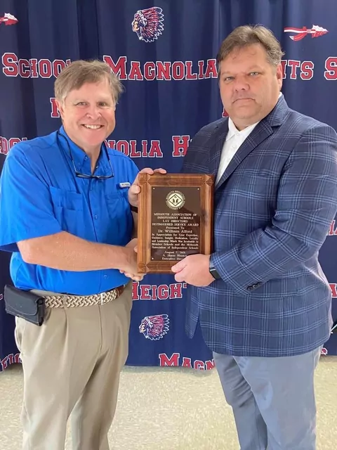 Dr. Bill Alford, President of the Board of Trustees at Magnolia Heights School, earned the Lay Directors Distinguished Service Award from the Mississippi Association of Independent Schools for his guidance, insight, dedication, loyalty, and leadership in education. Presenting Alford with the award is MAIS Executive Director Dr.