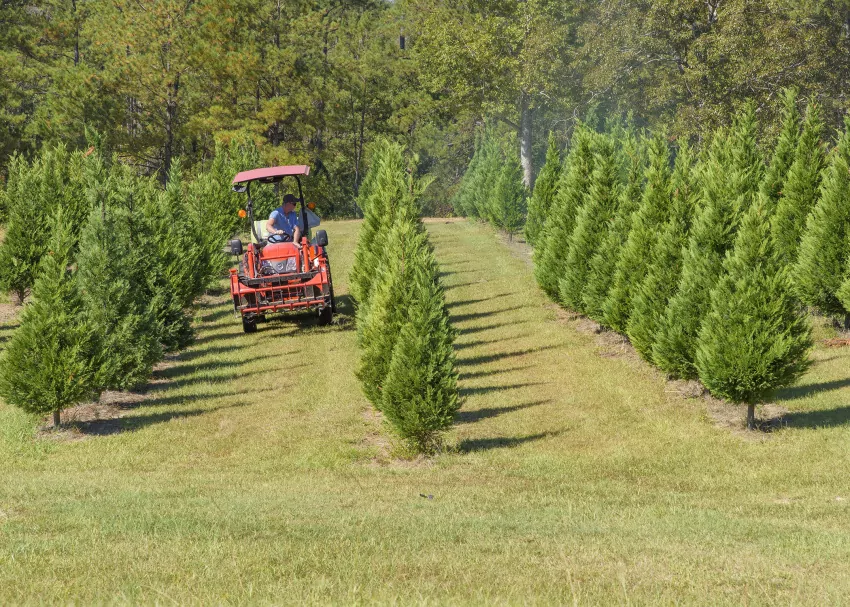 Mike Haley, who co-owns Holly Berry Christmas Tree Farm in Saucier, Mississippi, sprays the trees Oct 14, 2022. Choose-and-cut Christmas trees fared well despite drought conditions across Mississippi this year. (Photo by MSU Extension Service/Kevin Hudson)