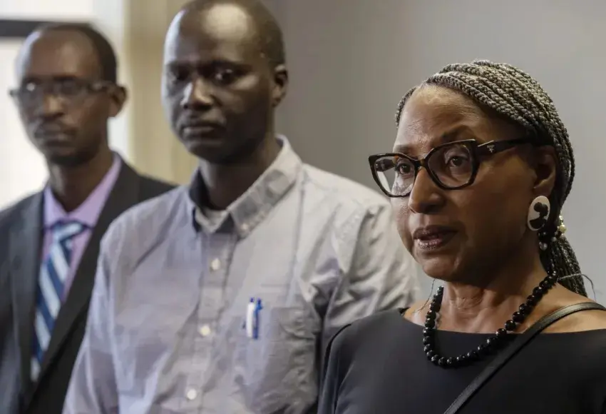 Bul Mabil, right, listens as Karissa Bowley answers questions during a court hearing concerning the investigation of the death of her husband, Dau Mabil, at the Hinds County Chancery Court in Jackson, Miss., on Tuesday, April 30, 2024. Credit: Eric Shelton/Mississippi Today
