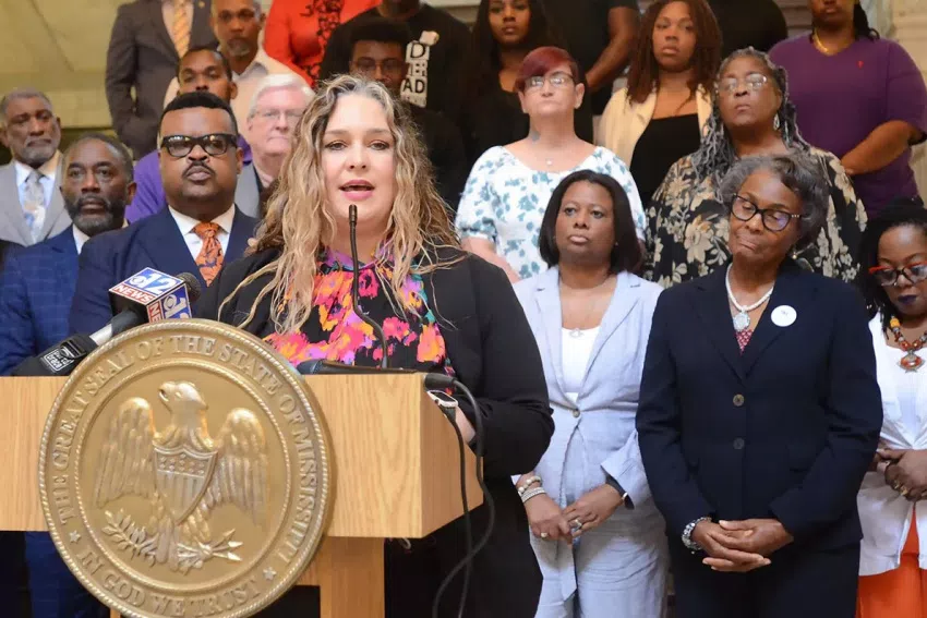 Emillee Shell, along with legislators and other supporters, promise to continue the fight for the right to vote for herself and others, during a press conference at the state Capitol, Wednesday, April 17, 2024. Credit: Vickie D. King/Mississippi Today
