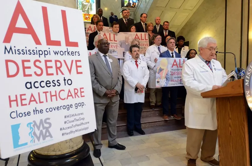 Dr. John Mitchell, Mississippi State Medical Association (MSMA) President, with physicians from across the state, endorses Medicaid expansion and closing the gap in health care coverage, during a press conference held at the State Capitol, Thursday, March 21, 2024 in Jackson. Credit: Vickie D. King/Mississippi Today