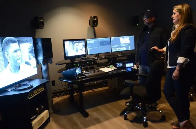 Mississippi Public Broadcasting's Chief Content Officer Taiwo Gaynor, left, and Chief Operating Officer Anna Neel watch Gaynor's promo for a documentary on Civil Rights leader Medgar Evers at MPB headquarters, Friday, Aug. 1, 2025, in Jackson. Credit: Vickie D. King/Mississippi Today