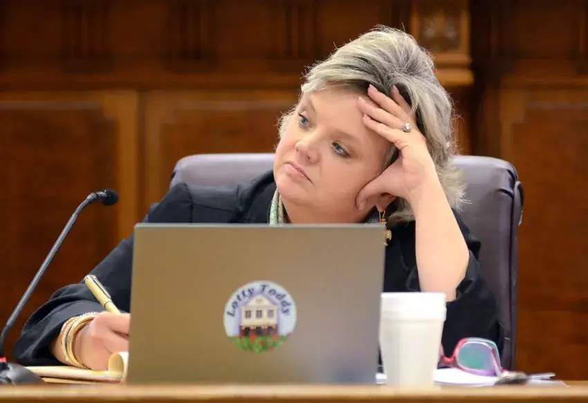 Sen. Nicole Boyd, R-Oxford, takes notes during a presentation by Mississippi Department of Child Services Commissioner Andrea Sanders, during a study group on women, children and family, held at the State Capitol, Wednesday, Oct. 2, 2024 in Jackson. Credit: Vickie D. King/Mississippi Today