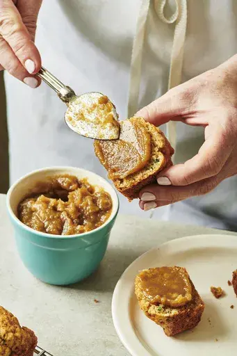 Apple butter is delicious on bread and toast of all kinds. Pumpkin bread or zucchini bread are also great options, underscoring the whole autumnal vibe.