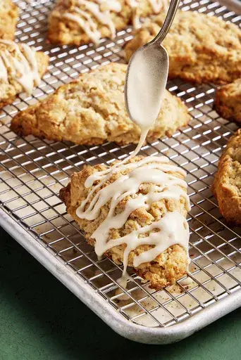 To make the glaze, in a medium bowl, whisk the melted butter, powdered sugar, maple syrup, buttermilk and nutmeg until smooth. The glaze should have the consistency of pourable yogurt; if it’s too thick, thin it by stirring in additional buttermilk 1 teaspoon at a time. Set the rack with the scones in the reserved baking sheet. Using a spoon, drizzle the glaze onto the scones (it’s fine if they’re still slightly warm), then sprinkle with the remaining toasted oats. Let the glaze dry for at least 10 minutes.