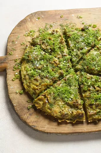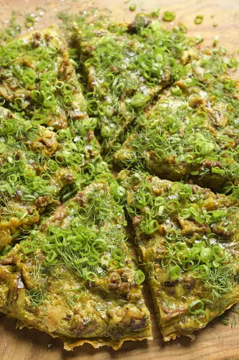 We keep things lighter and more flavorful with Egypt’s spiced frittata-like eggah, which is substantial but balanced, with layer upon layer of flavor thanks to a trio of spices and fresh herbs and scallions.
