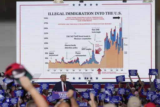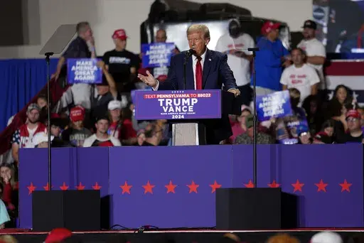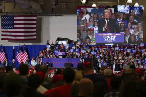Trump's rally in Erie, Pennsylvania, took on similar themes as an event one day earlier that he himself described as a “dark speech.” He told a cheering crowd Sunday that Harris was responsible for an “invasion” at the U.S.-Mexico border and "she should be impeached and prosecuted for her actions.”
