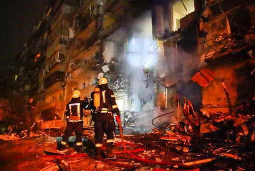 A missile slammed into a high-rise building on the southwestern outskirts of Kyiv, Klitschko said Saturday. He said rescue workers were heading there and posted an image on a messaging app, showing a gaping hole on one side of the building.