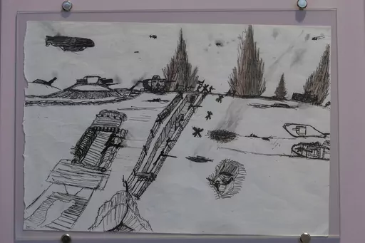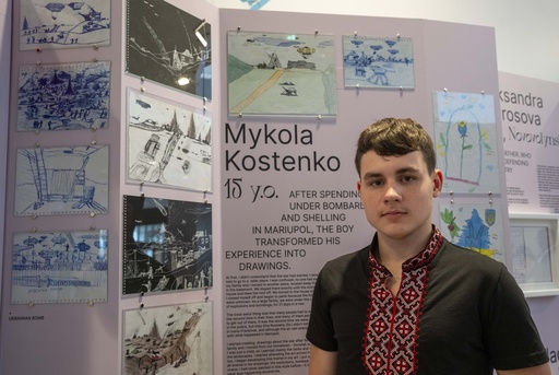 Among them is the artwork of Mykola Kostenko, now 15, who spent 21 days under siege in the port city of Mariupol.