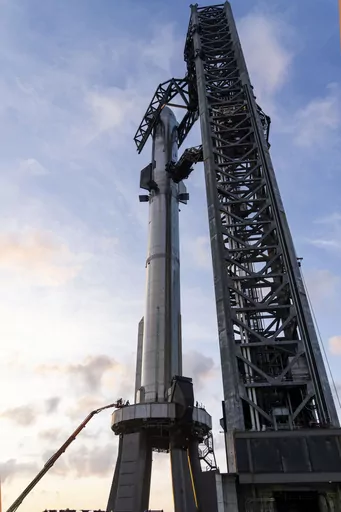 It will be the first launch with Starship's two sections together. No one will be on on board. Early versions of the sci-fi-looking upper stage rocketed several miles into the stratosphere a few years back, crashing four times before finally landing upright in 2021. The towering first-stage rocket booster, dubbed Super Heavy, will soar for the first time.